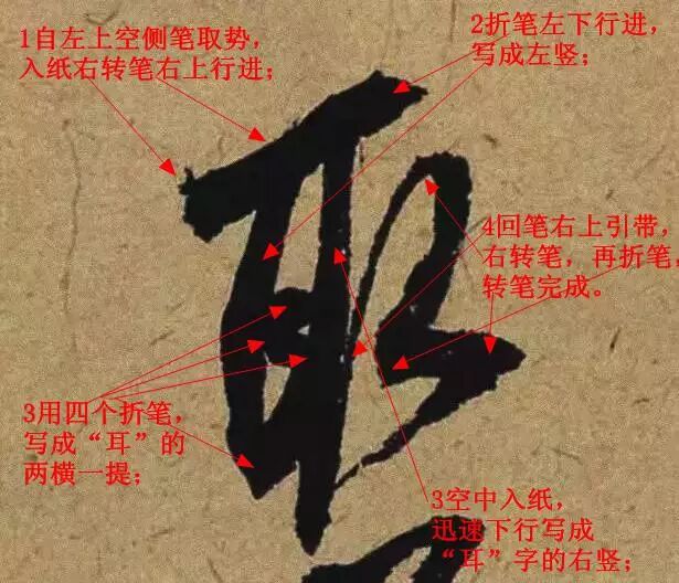 自左上空侧笔取势,入纸右转笔右上行进,再折笔左下行进,写成“耳”字的左竖;再提笔,用四个折笔,写成“耳”字的两横一提;再空中入纸,迅速下行写成“耳”字的右竖,再回避右上引带,右转笔,再折笔,转笔完成“取”字。