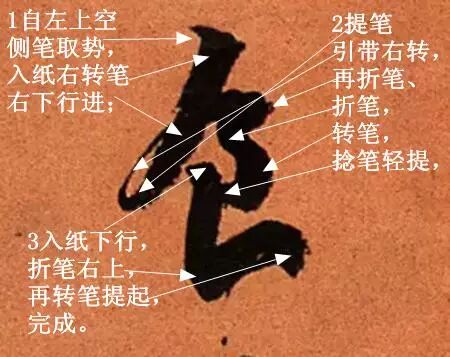 自左上空侧笔取势,入纸右转笔右下行进,再提笔引带右转,再折笔、折笔,转笔,捻笔轻提,再入纸下行,折笔右上,再转笔提起,完成。