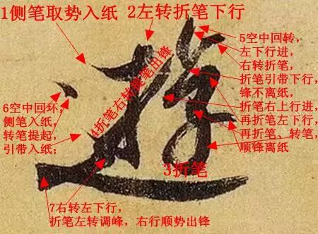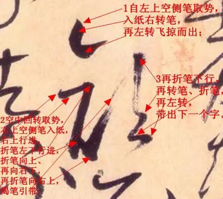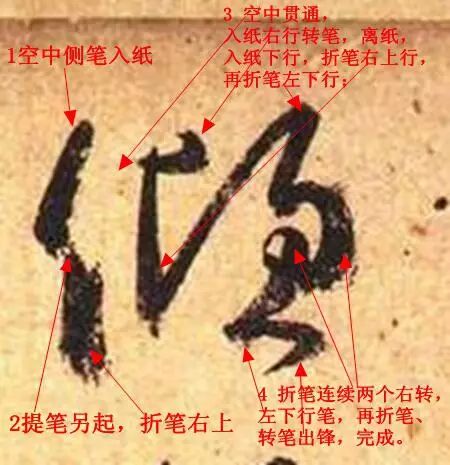 自左上空侧笔取势,入纸右转笔,再左转飞掠而出;空中回转取势,右上空侧笔入纸,右上行进,断然折笔左下行进,折笔向上、再向右下,再折笔向右上,渴笔引带,再折笔下行,再转笔、折笔,再左转,带出写一个字。
