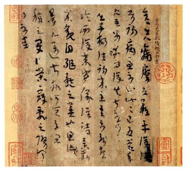 《平复帖》用秃笔渴墨写成。这是“属”字的草写,自左上空,侧笔取势,入纸笔左转右向行进,折笔左下行进,再折笔右向行进提笔;另起笔右转下行,再折笔右上转随势出锋,完成“属”字。